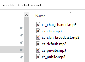 /.runelite/chat-sounds/directory and replace the corresponding mp3 file(s) to use custom sounds. For example, if you want a custom sound effect for Clan Chat messages, you would replacecs_clan.mp3with a different mp3 file of the same name.