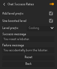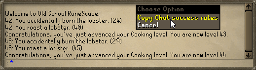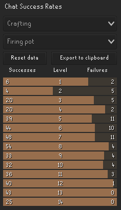 The success rate of most skilling actions in-game depends on your current skill level. This plugin can be used to estimate the success rate of a skilling action that returns a message for both success and failure by counting the frequency of each result (suffix in parentheses) per level (prefix before colon). The resulting success rate data can be exported to your clipboard by right-clicking the chat message interface and selecting Copy Chat success rates.